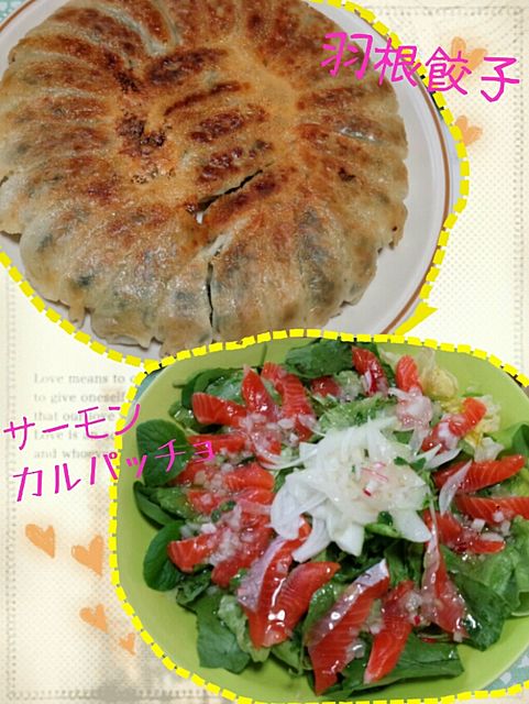 今日は餃子パーティーしたあ♪♪ 羽根つき餃子(o^^o) あと、サーモンカルパッチョ♪♪ 胃が元気(笑)