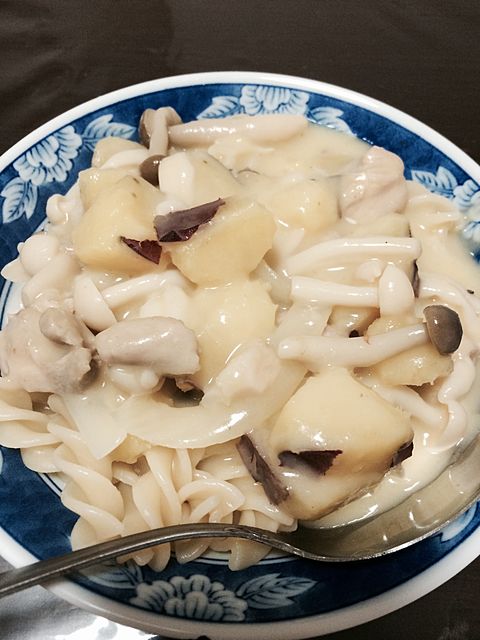まず鶏モモ肉を軽く焼いて、適当に切ったさつまいもと玉ねぎ、しめじを炒めて、水で10分ほど煮込んでシチューのルーを入れて、牛乳で味を整えて完成!