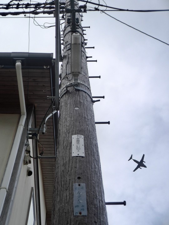 仕事で、 電柱に付いてる街灯を撮ったら、 ちょうど 飛んで来た自衛隊の飛行機が写った。 このタイミングは とても珍しい。