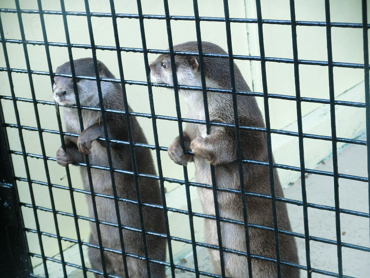 「コツメ カワウソ」という動物。 手をうまく使うことができる。 前回 見に行った時は 2匹で仲良く じゃれついてた。 今回行った時は、 直前に誰かにエサをもらったのか、 網に貼り付いて誰かを呼んでるようだった。