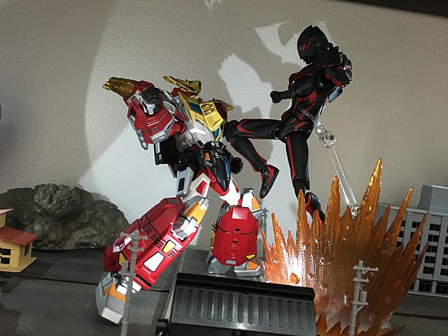 久しぶりにフィギュア弄ってたらだんだん盛り上がっちゃって、特撮スタジオ風ジオラマあるからなんかやってみよう。ということで撮った一枚。 付属のLED照明使ってみたけど、壁際の飾り棚でやったからどうしても影ができちゃう。 スタジオで空や背景に影ができないように撮ってる制作スタッフって、やっぱ凄いんだなぁ