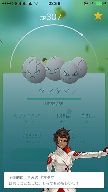 片っ端から手持ちのポケモンを調べていたらタマタマ個体値の評価が「きみのタマタマ頼もしい」とか「きみのタマタマ小さい」となんだか卑猥だった。