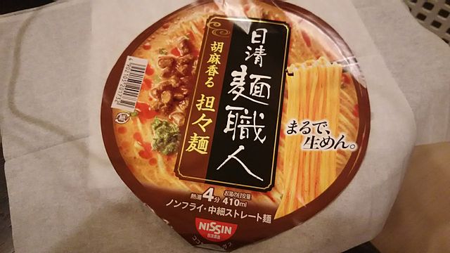 本当に今、食べたインスタントラーメン…惜しい 『日清 麺職人 胡麻香る担々麺』スープはめちゃ美味しいですけど麺は細麺で少し物足りない感じが致しました。太麺だと大満足でした。 スーパーで90円以下で売ってたから文句も言えませんね(笑)