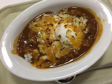 普通のカレーに、溶けるチーズと温泉卵が乗ってるだけで、焼いてません。