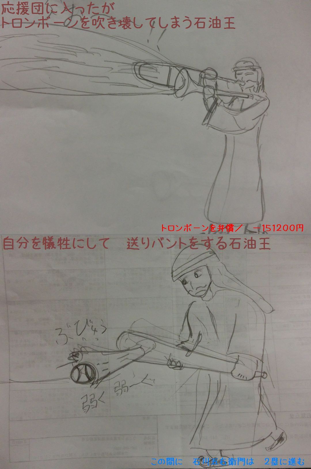 自主制作漫画「石油王」、超ラフ画、6ページ目 見本。 トロンボーンが脳内再生だけでは全く描けず、 画像で調べて見ながら描いた。 白黒漫画より カラー漫画のほうが、 噴出してる石油が分かり易いから そうするかい?