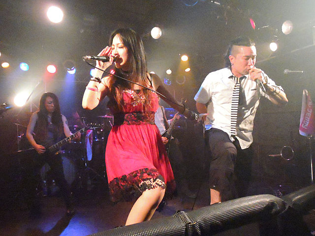 バンド「MECHANICAL TEDDY(メカニカル テディ)」。 女性ギタリストのMAYUさんの持つギターが、 いつもはオレンジ色だけど この日は色が違うように見える。 「照明の具合で そう見えるのかなぁ」と最初は思っていたが、 やっぱり 色が違う。 同じメーカー・同じ形で、色と中身が違うギターを買ったんだって。 V型は 軽くて いい って。