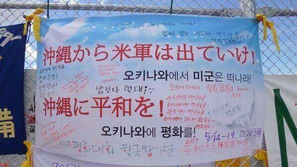 沖縄のデモにとんでもない看板がぁ~ 下チョーセン(北チヨンセンのスパイも含む) 売国パヨクと一緒に行動 全員、凶暴罪で逮捕ぢゃ そして、人口も食料も少ない北チヨンセンに追放や