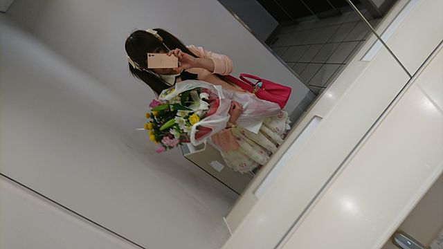 花束を抱えてるのは、どこかを卒業してきたのかな?
