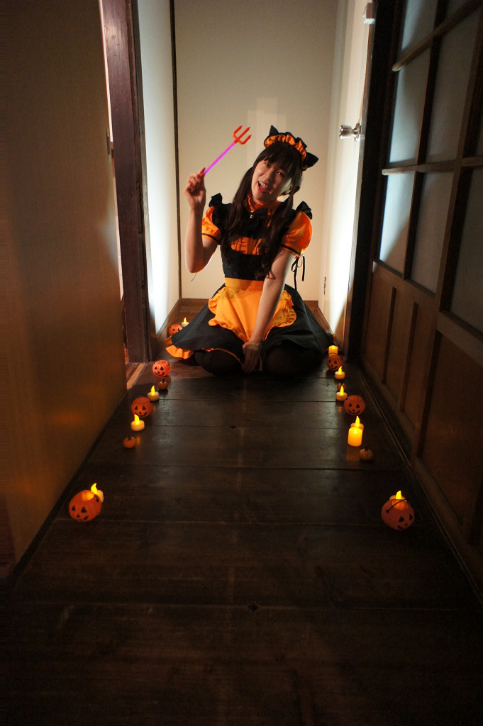 普段は撮影会に 小道具を持って行く事がない私が 初めて 小道具を持っていった。 撮影会主催者さんが 「廊下にキャンドルを並べましょう」と言った時、そこで 『あ!! オレも 小道具 用意してたんだ!』と思い出した。 小さなカボチャ・4個 × 2 光る三つ叉のヤリ、 わざわざ前日に100円均一ショップで買ったんだ。