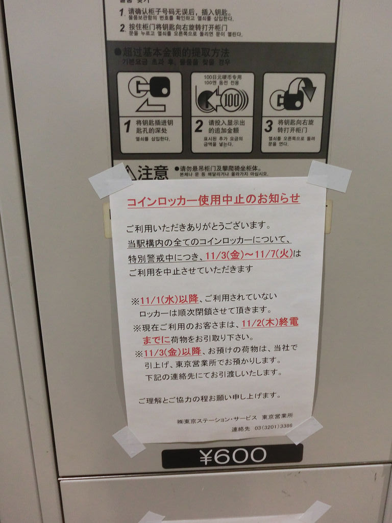 昨日、品川駅を利用した。 品川駅のコインロッカーが 特別警戒中につき 全部 使用禁止になってた。 私は見てないけど 東京や新橋なども そうかも知れない。 都心に来る旅行者は お気を付け を。 外国人観光客らしき人が とても困ってましたワ。