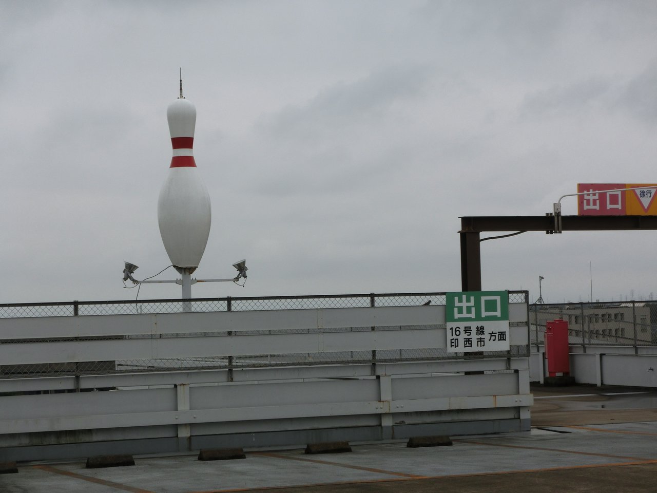 1階に、激安スーパー と パチンコ店が入り、 2階は、雑貨屋 と ゲームコーナー と ボウリング場 が 入ってる店舗の5階・屋上駐車場から見た景色。 ピンの上に立ってる物は なんだろう? 避雷針??