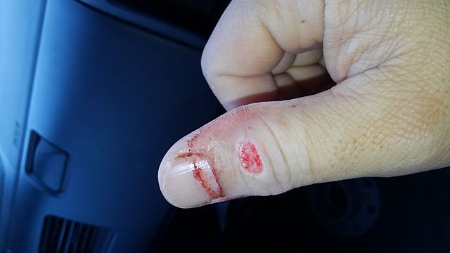 カッターナイフの柄と刃の間に皮が挟まっていたので、傷口に戻したら早く治るかな?と思ったんだけど、衛生上ヤバそうだったので、傷口を早く治せる絆創膏(キズパワーパットとか)で対処