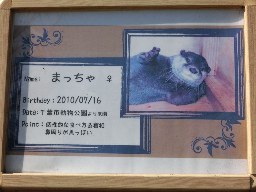 東武動物公園の コツメカワウソの紹介パネル。 写真のポーズが腹立たしい。