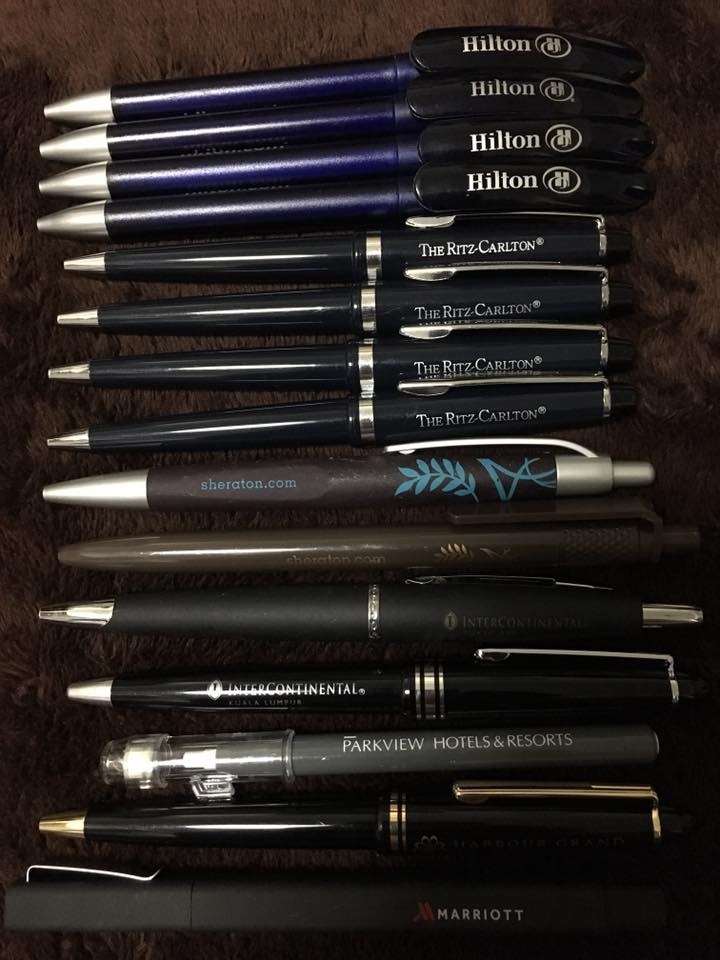 ヒルトン・リッツ・シェラトン・インターコンチ・マリオットなど、、、宿泊以外でも、仕事柄ミーティングルームを借りるとボールペンやレポート用紙が付いて来る。なので、なんとなくもらって来たり。←結果、増えすぎw