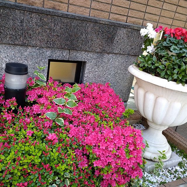 近所のマンションの入り口(暗唱キイの鉄柵のの外)のつつじがきれいです。