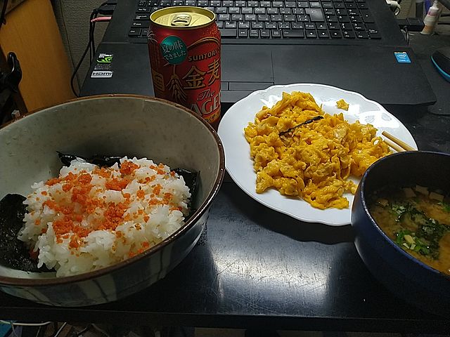 朝 4時半頃バイトから帰って少し仮眠、10時半ころ起き出して炊飯をしかけてから洗濯。洗濯機が動いている間に、冷蔵庫の整理も兼ねて久しぶりに「紅白なます」を仕込みました。そうこうする間にご飯が炊けましたので、これまた冷蔵庫に残っていた鶏卵でスクランブルエッグ。