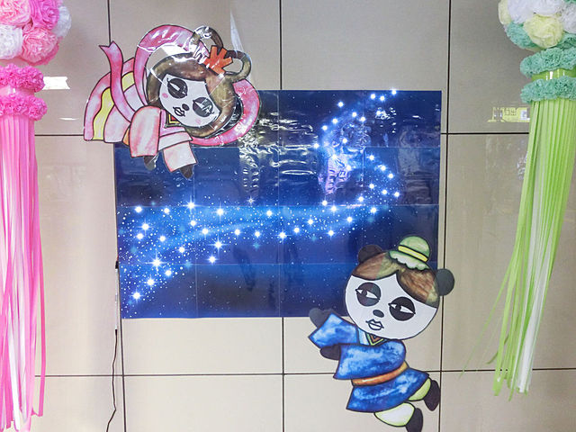 京成千葉駅の怪しいパンダ(京成電鉄のキャラクター)の絵が 七夕に変わっていた。