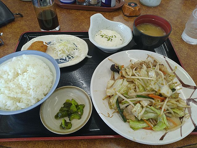 野菜炒め定食、とろろ付き。コロッケクーポンおまけのもの。モヤシもシャキシャキで醤油ベースの味付けです。