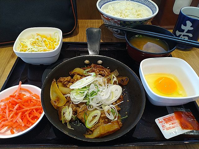 いつもの生姜焼き定食、かとも思いましたが、牛焼肉御膳(税込 712円)にいたしました。冬の時期の「牛すき鍋膳」の方が好みですが、オフシーズンなので、代わりにこれにしました。なまたまごをしっかり溶いていただきます!