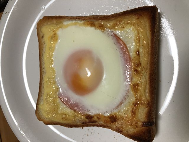 ラピュタパン! 私はいつもは朝ごはん食べへんけど 娘用に作りましたー(^^) ラピュタパンは食パンと目玉焼きやけど ハムの上にたまご乗せて 周りにマヨネーズしてみた(^^)