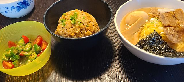 あとはチャーハンを適当に作って(笑)、オクラとキュウリとミニトマトをゴマ油と醤油、生姜すりおろしと、ポン酢であえたの。
