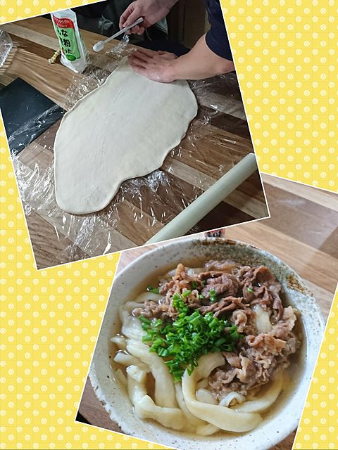 お題でボケるのはこれくらいにしておいて、今日はウチのバカ息子が急に「うどんを打ちたい!」と言い出しまして、11時から作り始めたのはいいのですが食べれたのは2時でした(^_^;)