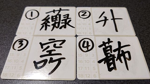引いたカタカナ語に対して一文字の漢字を作り、それを当ててもらうゲームです。