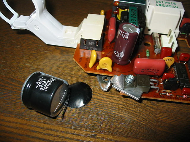 膨らんでいて頭のシールが裂けていました、基盤を取り外して、裏側から半田ゴテで半田を溶かして