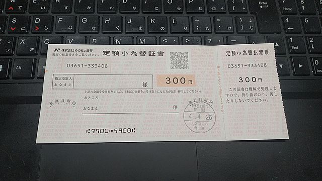 写真の 『定額小為替証書』 みたことありますか? これを郵便局に持っていくと 300円 貰えるのです。