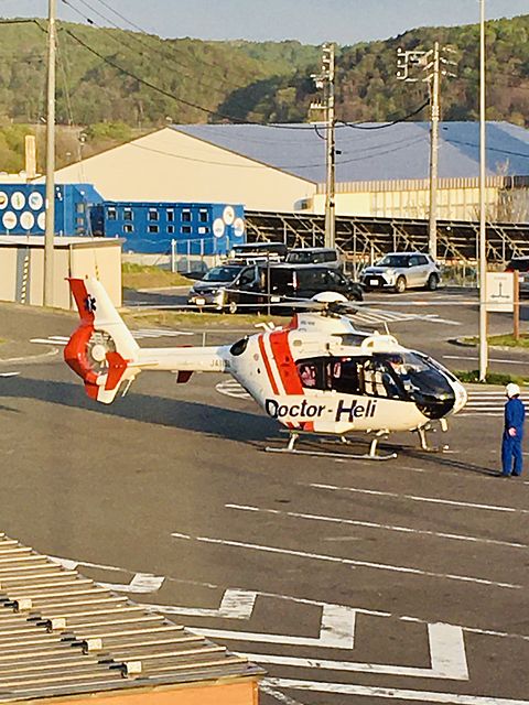 ドクターヘリ駐車場に着陸しますので車の移動をお願いします」