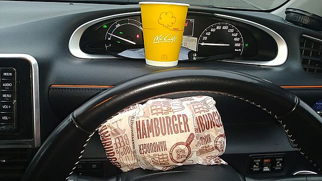 少し時間の余裕がありますので、定番の単品ハンバーガー3個と珈琲、たしか 550円の組合せと思ってたら、今日のお会計は 540円。微妙に安いような。珈琲の値段かな?まあ、いまどき嬉しい事ですね。