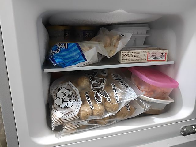 業務スーパーで買ってきた肉団子とシーフードミックスが目立っていますが 他には明太子と豚丼の具にエッセルスーパーカップ(6個)に、豚こまと冷凍から揚げ‥‥スライスした長ネギに、ミックス野菜。それと製氷皿に、何故かバター(これは長期保存前提だから)‥‥。
