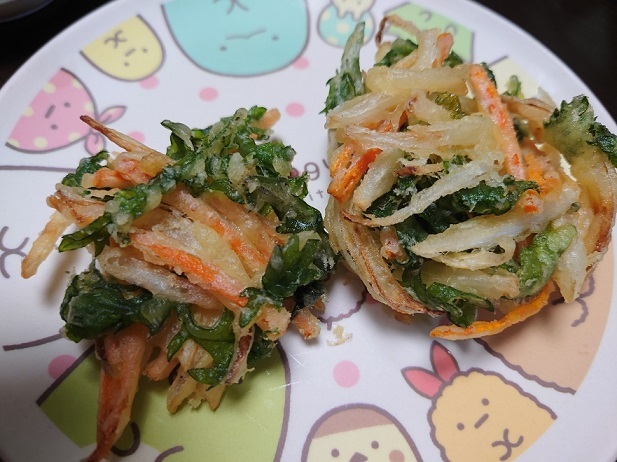 揚げ油を残していたので野菜かき揚げでも。