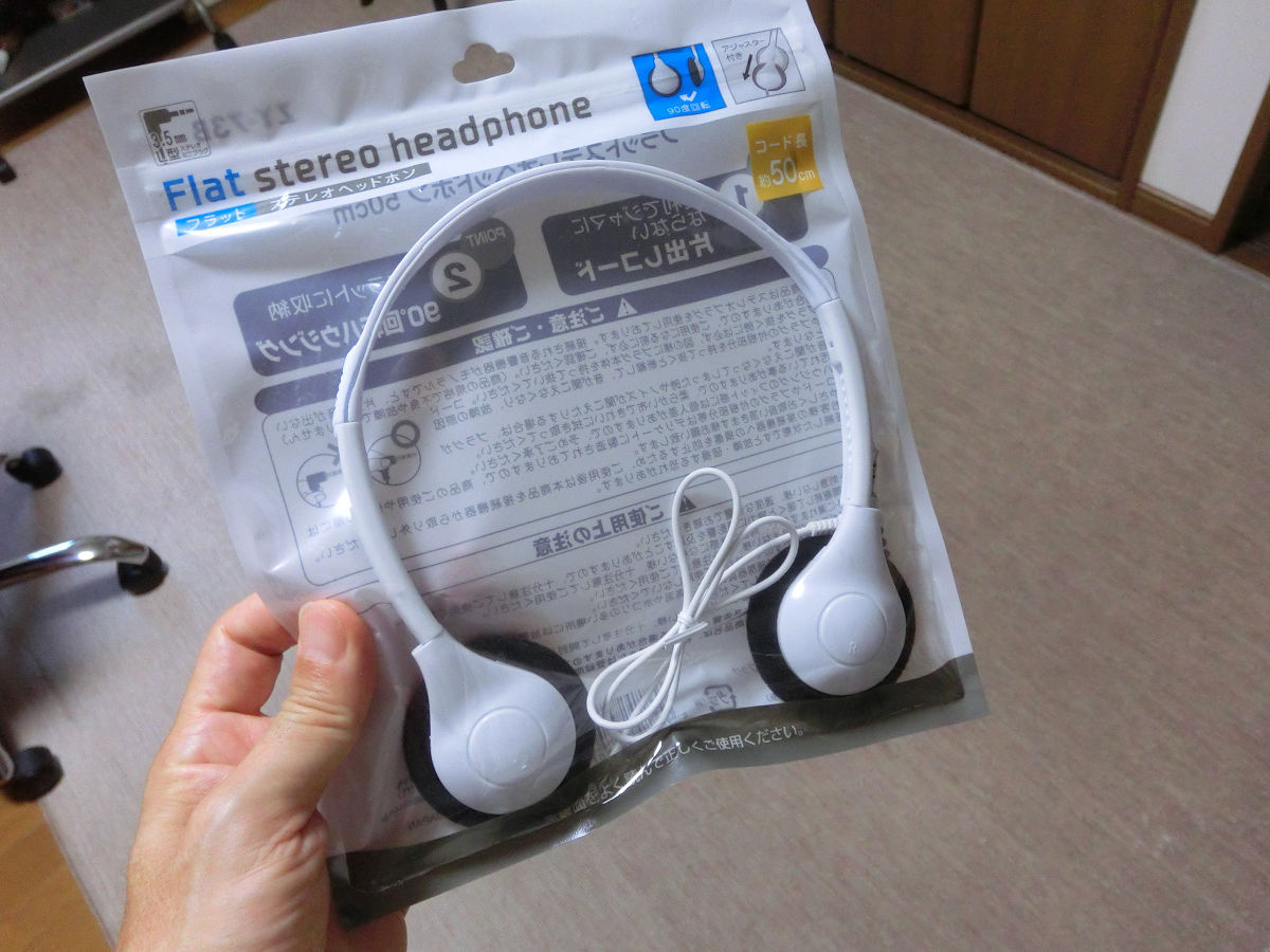 7月11日に 100円ショップで買ったヘッドフォン。 パソコンをやりながら 超長時間 音楽を聞くには、 私には こういう軽いヘッドフォンが いい。 前の物が壊れたから(何年も使った)買ったが、 早くも 聞こえにくくなってきた。 また替えなきゃ。