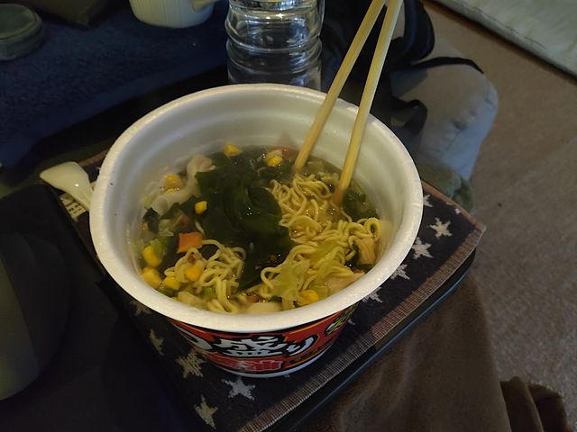 マルちゃんごつ盛醤油に業務スーパーで売られている乾燥野菜ミックスを入れて 昨日夜勤明けのブランチ。