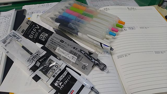 本業の仕事では、机の上で簡単なメモ書きをします。文章を書くのではなく、素早くメモる感じ。決まった帳票の枠内にメモする感じです。このとき使うボールペンの書き味が結構重要。数文字を素早く、割と小さなスペースに書くので細書きの 0.5 ミリ芯のボールペンを使います。何種類かあるのですが、微妙な点でやはり好みが出てくるようで、使うものは机に用意しているものの中でも決まってきます。パイロットのアクロボールと、三菱 UNIのジェットストリームが今のところのお気に入り。替芯も用意しています。