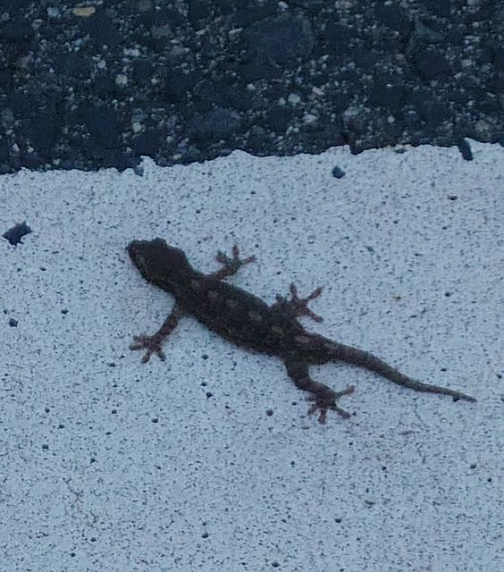 今朝も元気に冒険していたら、横断歩道を歩くヤモリと遭遇したのですが、渡る気が無くなったのか途中で止まっちゃいました。