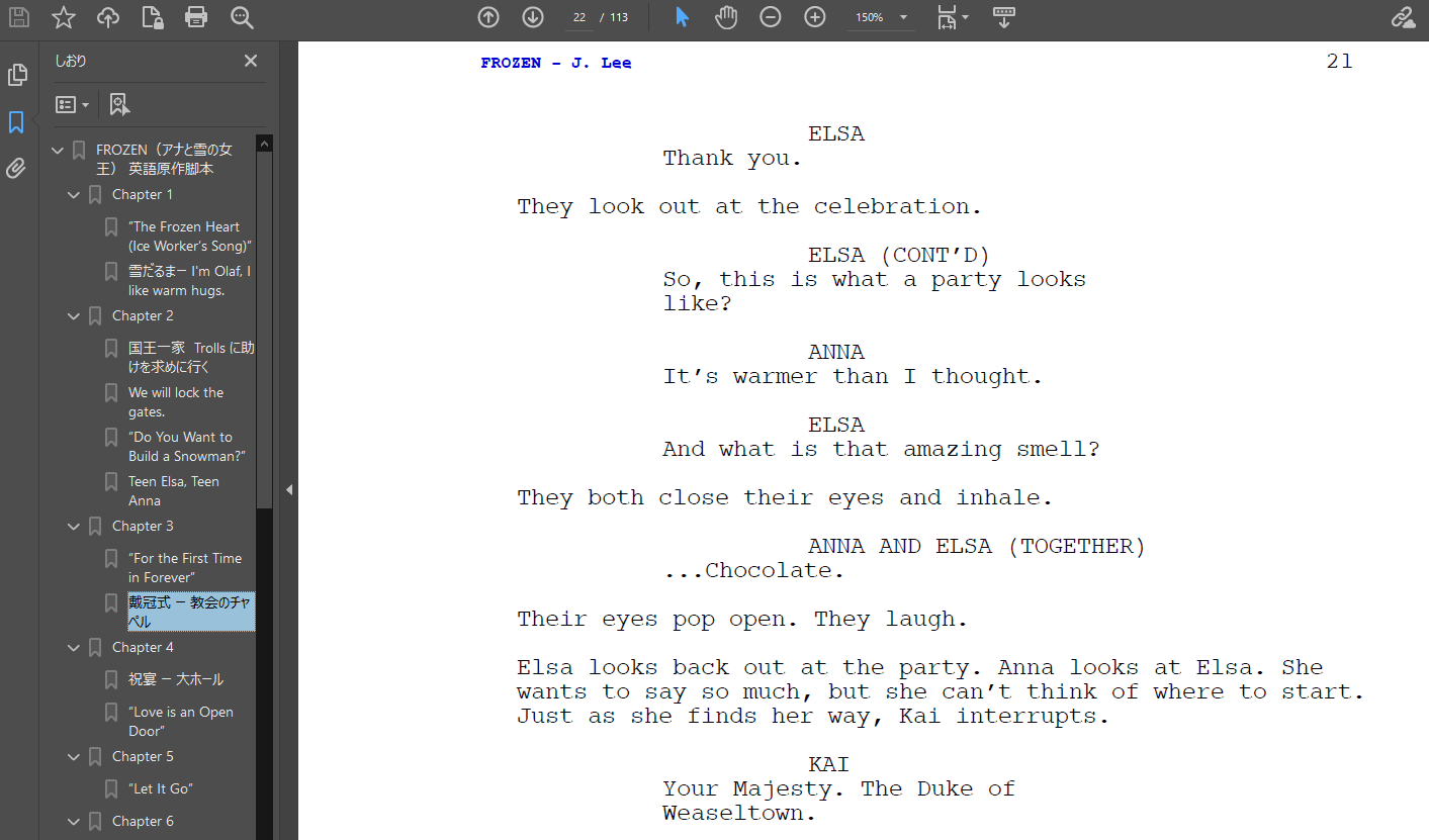 というか私のパソコンのデスクトップに、PDF 版の『Screenplay』英語の脚本があるのです。これってとても英語の勉強になりますよね、英語好きな中学・高校生の居るお宅の親御さん、ぜひ1度ご覧になって観てください。(PDF で 500kバイトほど、ご希望者はひとこえ!) 写真は『戴冠式』の「チョッコレート!」のシーンですね。ぎこちない会話の姉妹がそこに居ます。