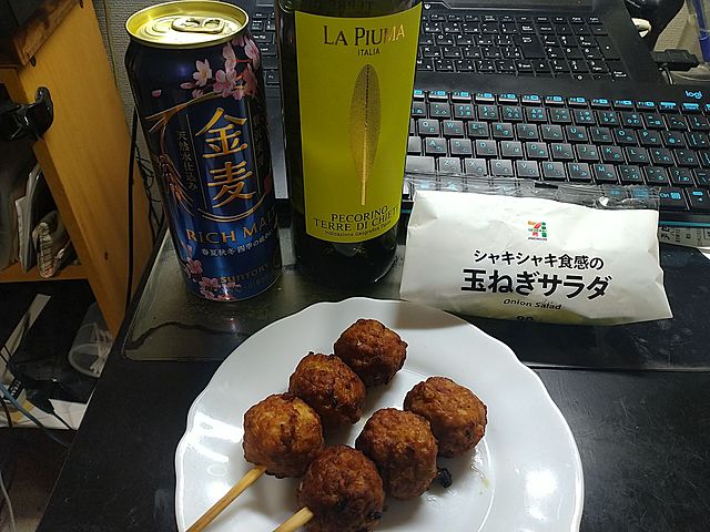 今夜のバイトはありませんでした。やる気満々で途中まで出かけて「コンビニめぐり」してきました。珍しくローソンに寄ったら「めっけもの」成城石井のワインが数種類置いてあるではないですか?さすがに私の所望するドイツ(モーゼル)は無かったものの、イタリアの白の良さそうなものを一本仕入れてきました。写真の「つくね」も案外イケました。白ワインを堪能しながらの日記です。