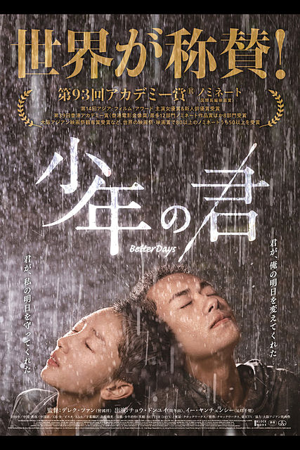 チョウ・ドンユイ主演他。君が、俺の明日を変えてくれた。君が、私の明日を守ってくれた。進学校に通う成績優秀な高校3年生のチェン・ニェン(チョウ・ドンユイ)。全国統一大学入試を控え、殺伐とする校内で、ひたすら参考書に向かい息を潜め卒業までの日々をやり過ごしていた。そんな中、同級生の女子生徒がクラスメイトのいじめを苦に校内で自殺してしまう。女に死体に無遠慮に向けられる生徒たちのスマホレンズ。その異様な光景に耐えられなくなったチェン・ニェンは、遺体にそっと自分の上着をかけた。しかし、そのことをきっかけに激しいいじめの矛先はチェン・ニェンへと向かうことに。彼女の学費のために犯罪スレスレの商売に手を出している母親以外に身寄りはなく、頼る者もいないチェン・ニェン。同級生たちの悪意が日増しに激しくなる中、下校途中の彼女は集団暴行を受けている少年を目撃し、とっさの判断で彼シャオペイ(イー・ヤンチェンシー)を窮地から救う。辛く孤独な日々を送る優等生の少女と、ストリートに生きるしかなかった不良少年。二人の孤独な魂は、いつしか互いに引き合っていくのだが・・・。世界が絶賛!壮絶ないじめ、苛烈な受験戦争、ストリートチルドレンなど社会問題を描いたサスペンス・ラブストーリー。第93回アカデミー賞ノミネート作品。
