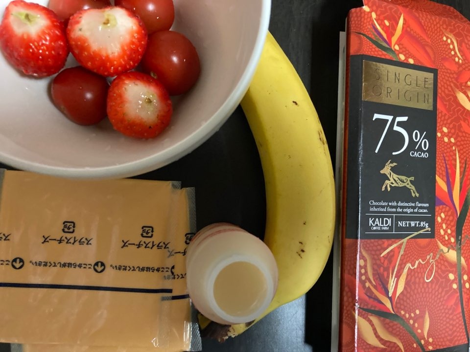 朝御飯は、バナナにミニトマトにイチゴ、チーズ、乳酸菌飲料、〆はコーヒーではなく、カカオ75%のダークチョコ。チョコはミルクよりブラックが好きなん。
