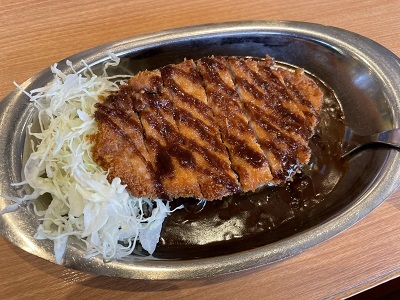 ステンレス皿、キャベツ同時盛り、揚げ物トッピング、フォークで食べる、が金沢カレーの定義です。