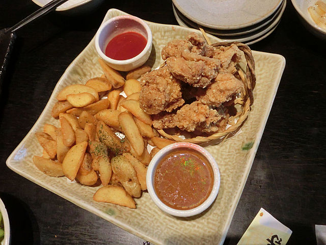 7月4日に 居酒屋で食べた物。 「ポテト用に2つのソースが出てきた」と思って、 ポテトに2種類のソースを付けて食べたが、 今 冷静に考えると、 「ポテトにケチャップ。唐揚げにガーリックソース。」だったのではないだろうか?