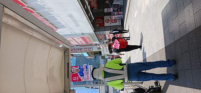バス停警備員さんも暑い中、扇風機つきの上着着て乗客案内