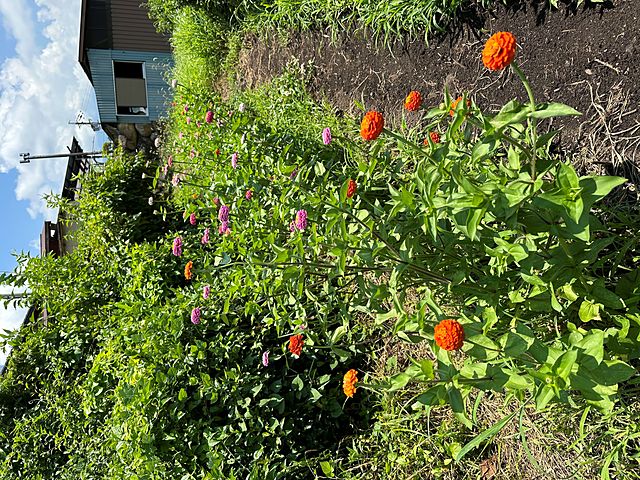 今年、私の園芸関係の一番のヒットはこれか? ポンポン百日草。今日の姿です。こんなに大きくたくさん咲くとは思わなかった。畑に行く道に均等に直播きしておいたのがこんなになるとはちょっと意外でした。ちょっと前にも写真載せてますが、より大きくたくさんの花がついています。