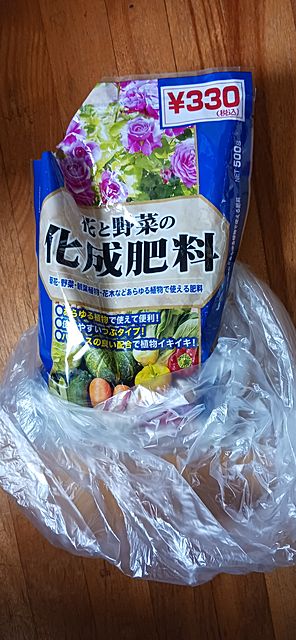 以前の100円ショップでよく見かけた 化成肥料 が見かけなくって、かさばる 腐葉土 ばかりだなと思っていましたが、今日たまたま見つけた――と思ってレジへ。