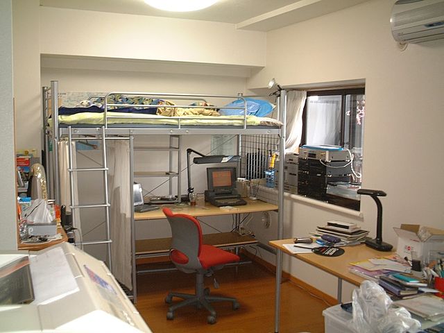 写真はルームシェアを始めたころの私の生活エリア。3LDKの部屋に最大4名住んでてことがあって私の居場所はリビングの一角、このデスクベッドだったりしました。つまり家主が独立した部屋がない状態でした。その昔使っていた東芝のプラズマデスクトップが懐かしいです。