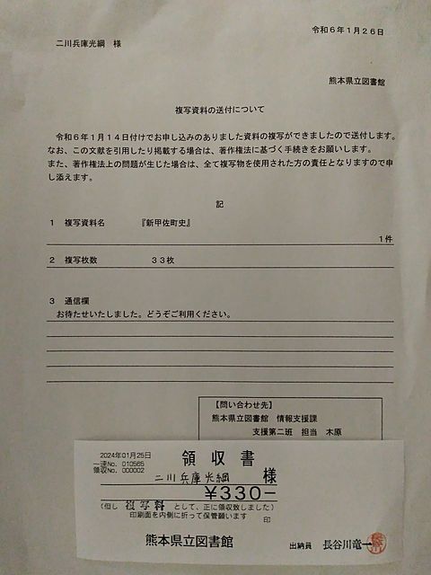 『壱月三十零日』に『隈本縣上益城郡新甲佐町史』の『複写書』を『獲得』