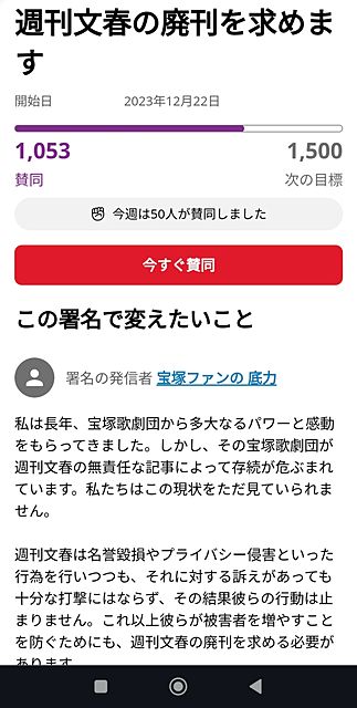一部の宝塚のファンが〝週刊文春廃刊を求める〟署名運動を展開して暴走中らしい。