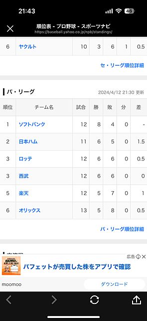 昨日ソフトバンクに負けて4位を転落しましたが、今日また2位に返り咲きました♪( ´▽`)